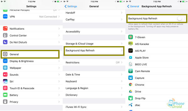 3. ปิดการใช้งาน Background App Refresh เข้าไปที่ Settings > General > Background App Refresh > Off (การตั้งค่า > ทั่วไป > ดึงข้อมูลใหม่ให้แอพอยู่เบื้องหลัง > ปิด) เป็นการปิดการทำงานเบื้องหลังของแอพต่างๆ หลังจากที่ปิดแล้วนอกจากจะช่วยให้ตัวเครื่องทำงานได้เร็วขึ้น ยังช่วยประหยัดแบตเตอรี่ด้วยครับ