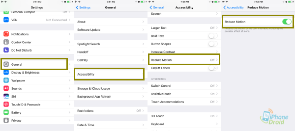 2.เปิดใช้งาน Reduce Motion เข้าไปที่ Setting > General > Accessibility > Reduce Motion > on (การตั้งค่า > ทั่วไป > การช่วยการเข้าถึง > ลดการเคลื่อนไหว > เปิด) หลังจากที่เปิดใช้งานแล้ว Effect ในการเปิดเข้าเมนูต่างๆ จะถูกปิดไป ซึ่งจะช่วยให้ทำงานได้เร็วขึ้น