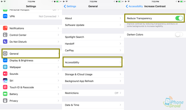 4.Turn on Reduce Transparency เข้าไปที่ Settings > General > Accessibility > Increase Contrast > Reduce Transparency > on (การตั้งค่า > ทั่วไป > การช่วยการเข้าถึง > การเพิ่มต่างระดับสี > ลดความโปรงใส > เปิด)หลังจากที่เปิดแล้วจะพบว่าพื้นหลังจะเป็นสีเข้มขึ้นไม่โปรงแสง