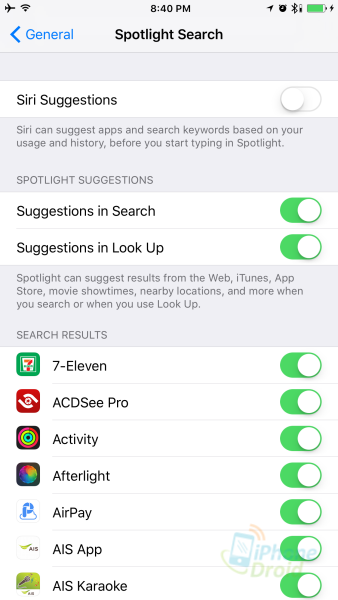 6. ปิดการใช้งาน Siri Suggestions เข้าไปที่ Settings > General >Spotlight Suggestions > Siri Suggestions > Off (การตั้งค่า > ทั่วไป > ค้นหาโดย Spotlight > คำแนะนำจาก Siri > ปิด) ตั้งค่าแล้วจะไม่มี Siri Suggestions ขึ้นมาให้