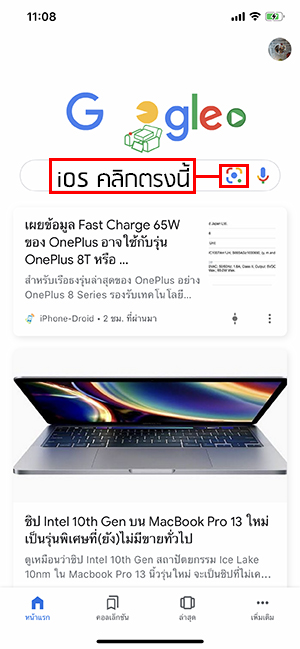 1.2 ถ้าใช้ระบบ iOS ให้เข้าแอป Google และกดที่สัญลักษณ์ Google Lens (ข้างๆ ปุ่มพูด)