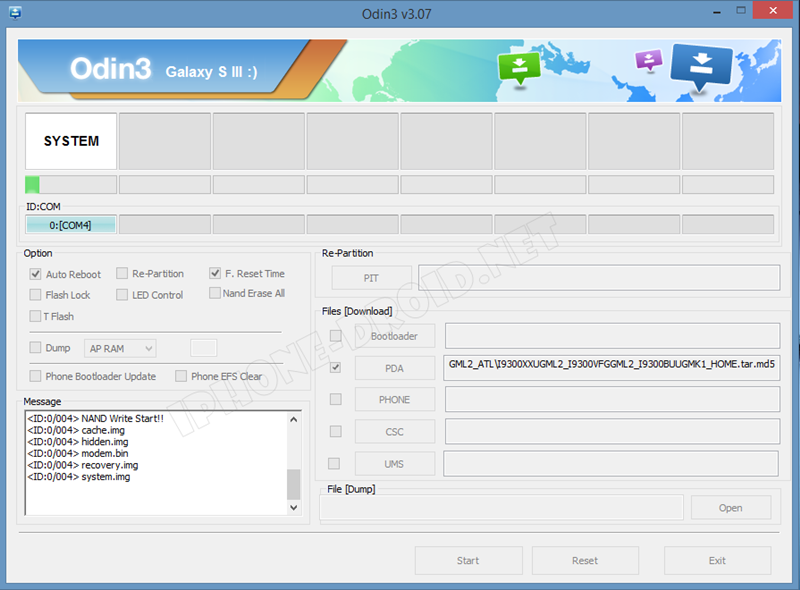 ติ๊กถูกที่ช่อง Auto Reboot กับ F. Reset Time และห้ามติ๊กที่ช่อง re-partition จากนั้นกด Start (ตามภาพด้านล่าง)