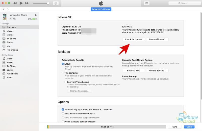 เชื่อมต่อ iPhone, iPod, iPad กับโปรแกรม iTunes บนคอมพิวเตอร์ โปรแกรม iTunes จะปรากฎชื่อรุ่น เบอร์โทร หมายเลขเครื่อง และ iOS เวอร์ชั่นล่าสุดที่ติดตั้งอยู่ คลิกที่ Check for Update เมื่อมีเวอร์ชั่นใหม่มาโปรแกรมจะดาวน์โหลดและติดตั้งให้อัตโนมัติสามารถทำตามขั้นตอนต่างๆ ที่โปรแกรมแนะนำได้เลย