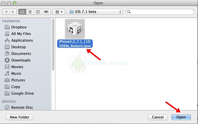 Step 4: เลือก Fw. IPSW IOS 7.1 beta ที่เราโหลดไว้ครับ เลือกที่ Open และ Update