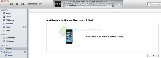 จากนั้นก็เริ่มใช้แอพ Remote เพื่อควบคุมการทำงานของ iTunes ครับ จะแสดงอัลบั้ม ชื่อเพลง โดยเราสามารถควบคุมการทำงานต่าง ๆ ของ iTunes ได้