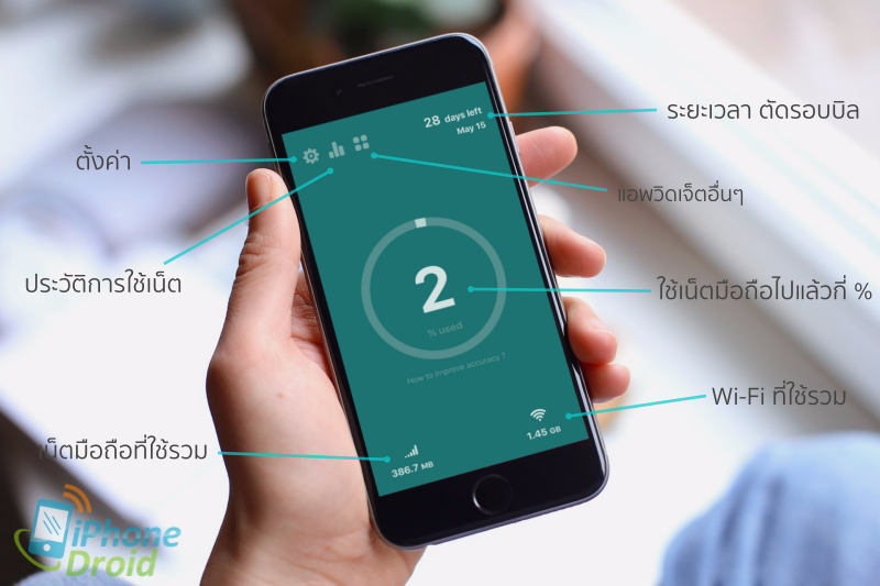 เพียงเท่านี้ก็จะมีวิดเจ็ตของ DataFlow Pro แล้ว ซึ่งคอยแสดงให้เราเห็นว่ามีการใช้งานเน็ตไปเท่าไหร่แล้วบ้าง สามารถติดตามการใช้งานเน็ตมือถือทั้งผ่าน Cellular ไม่ว่าจะเป็น 3G/4G LTE และ Wi-Fi ซึ่งจะแสดงข้อมูลให้เห็นกันแบบเรียลไทม์ พร้อมกับดูประวัติการใช้งานที่ผ่าน และตั้งวันที่ตัดรอบบิลเน็ตมือถือได้