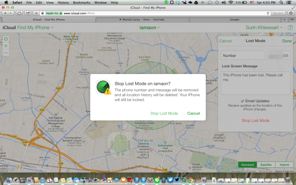 และฟังก์ชั่นสุดท้ายสำหรับ Find my iPhone นั่นคือ Erase iPhone ซึ่งเป็นคำสั่งลบข้อมูลของตัวเครื่องทั้งหมด ในกรณีที่มีข้อมูลที่สำคัญหรือคิดว่าไม่ได้คืนแล้วสามารถสั่งลบข้อมูลได้จากฟังก์ชั่นนี้