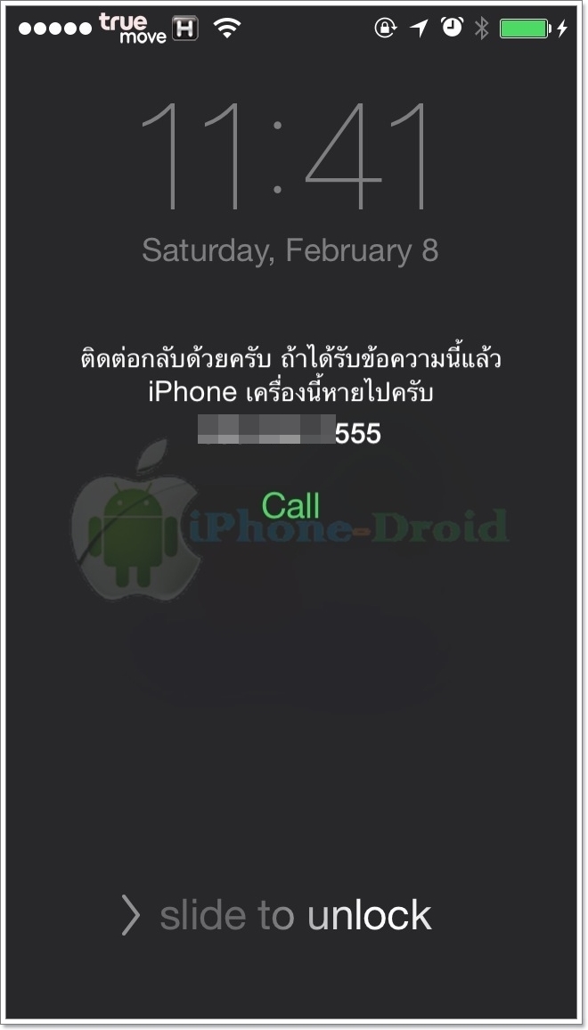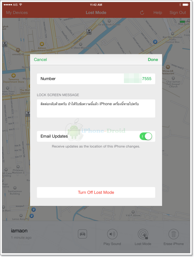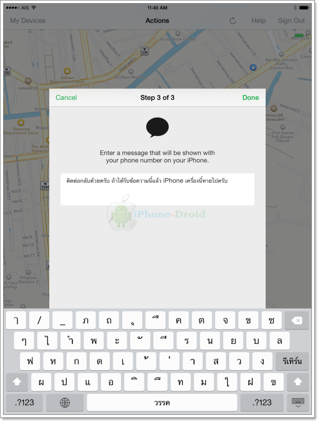 พิมพ์ข้อความเพื่อแจ้งให้ผู้ที่เจอทราบว่าเครื่องหายไป ให้ติดต่อกลับมาจากนั้นเลือกที่ Done แค่นี้ก็เรียบร้อยแล้วครับ