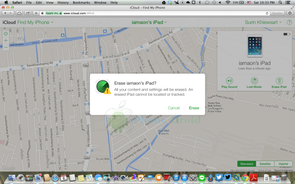 บนแอพ Find my iPhone สามารถสั่งลบข้อมูลทั้งหมดบนอุปกรณ์ต่าง ๆ ของเราได้เช่นกันครับเลือกที่ Erase iPad (ชื่อต่างกันไปแล้วแต่ละอุปกรณ์)