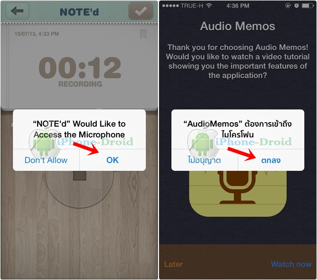 แบบในภาพด้านล่างนี้จะเห็นได้ว่าเมื่อเข้าใช้งานแอพต่าง ๆ ทุกแอพที่จะใช้ไมโครโฟนร่วมด้วย เช่นแอพดิกชั่นนารี่ , Instagram , LINE , Viber , Skype เป็นต้น แอพเหล่านี้ต้องใช้ไมโครโฟนร่วมด้วย ในการใช้งานแอพครั้งแรกนั้น จะต้องกดยอมรับเพื่อที่ใช้ไมโครโฟนด้วย จากตัวอย่างด้านล่างต้องตอบ Ok จึงจะสามารถใช้ไมโครโฟนได้ และหากตอบ Don’t Allow ไปแล้วจะทำให้ไม่สามารถใช้ไมโครโฟนได้ ยกตัวอย่างเช่นแอพ LINE ถ้ากด Don’t Allow เวลาโทรออกปลายทางจะไม่ได้ยินเสียงเป็นต้นครับ