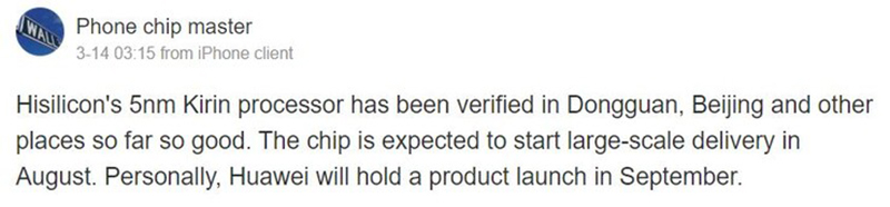 จากรายงานใน Weibo ระบุว่าชิปเซ็ตขนาด 5 นาโนเมตรเริ่มทดสอบแล้วในบางเมืองของประเทศจีน และ Huawei ก็น่าจะมีการเปิดตัว Mate 40 Series ในช่วงกันยายนทันที