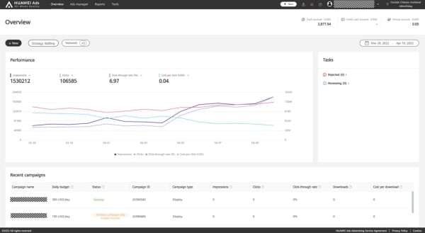 - HUAWEI Ads แพลตฟอร์มนำเสนอโซลูชันโฆษณาบนสมาร์ทดีไวซ์ในอีโคซิสเต็มของหัวเว่ย สำหรับแบรนด์และนักพัฒนาแอปพลิเคชัน เปิดโอกาสในการสร้างรายได้ผ่านฐานผู้ใช้งานอุปกรณ์ของหัวเว่ยอย่างครอบคลุมมากยิ่งขึ้น