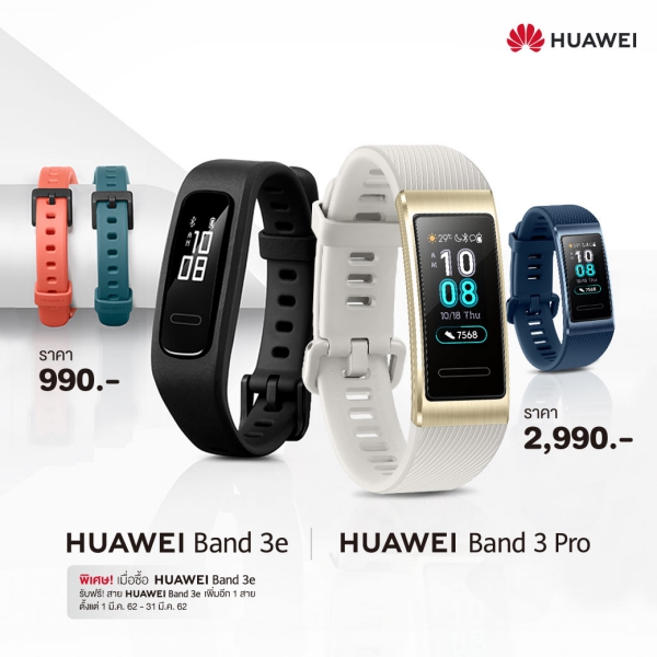 HUAWEI Band 3 Pro และ HUAWEI Band 3e พร้อมวางจำหน่ายอย่างเป็นทางการตั้งแต่วันที่ 1 มีนาคม ที่ หัวเว่ย เอ็กซ์พีเรียนซ์ สโตร์ ร้านตัวแทนจำหน่ายที่ร่วมรายการ และร้านค้าออนไลน์ โดย HUAWEI Band 3 Pro วางจำหน่ายในราคา 2,990 บาท มีให้เลือกสองสี ได้แก่ Space Blueและ Quicksand Gold ส่วน HUAWEI Band 3e วางจำหน่ายในราคา 990 บาท มีให้เลือกสองสี ได้แก่ Black และ Pink และสามารถเลือกเปลี่ยนสายรัดข้อมือได้ โดย Color Strap วางจำหน่ายในราคา 190 บาท มีให้เลือกห้าสี ได้แก่ Black, Pink, Orange, Cyan and Grey พิเศษ! เมื่อซื้อ HUAWEI Band 3e สี Black รับฟรี สายรัดข้อมือสี Orange หรือเมื่อซื้อ
