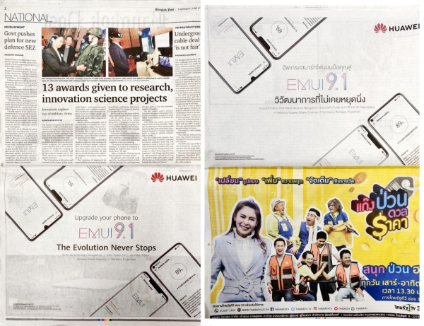 หัวเว่ย คอนซูมเมอร์ บิสสิเนส กรุ๊ป เดินหน้าสร้างการรับรู้ในกลุ่มผู้ใช้สมาร์ทโฟนของหัวเว่ยให้มากที่สุด หลังประกาศปล่อยอัพเกรดระบบปฏิบัติการ EMUI 9.1 ให้กับสมาร์ทโฟนหลายรุ่น และเพื่อเสริมความมั่นใจของผู้บริโภคในตลาด หัวเว่ย คอนซูมเมอร์ บิสสิเนส กรุ๊ป จึงได้ทำการสื่อสารความเคลื่อนไหวครั้งนี้ออกไปในหลากหลายช่องทาง รวมถึงการซื้อสื่อโฆษณาในหน้าหนังสือพิมพ์ชั้นนำด้วย