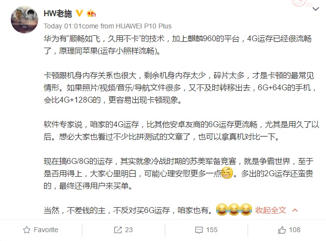 ผู้บริหารจาก Huawei (@HW Lao Shi) ได้โพสต์สถานะบนเว็บไซต์สังคมออนไลน์ชื่อดังของจีน Weibo เพื่อแสดงความเห็นเกี่ยวกับหน่วยความจำแรมของสมาร์ทโฟนที่มีขนาดใหญ่ขึ้น โดยเขาบอกว่าแรม 4GB สำหรับสมาร์ทโฟนก็เพียงพอที่จะทำให้การทำงานนั้นราบรื่นแล้ว จากการทดสอบสมาร์ทโฟนของ Huawei ที่ใช้ชิปเซ็ต Kirin 960 กับแรม 4GB พบว่าทำงานได้ราบรื่น ดีกว่าสมาร์ทโฟนบางรุ่นที่มีแรม 6GB ซึ่งหัวใจสำคัญอยู่ที่การปรับแต่งทั้งตัวระบบปฏิบัติการและฮาร์ดแวร์ให้ทำงานร่วมกันอย่างลงตัวที่สุด อย่างเช่นระบบปฏิบัติการ iOS ที่ไม่ต้องการหน่วยความจำแรมที่มากเกินความจำเป็น แต่ก็ทำงานได้อย่างราบรื่น