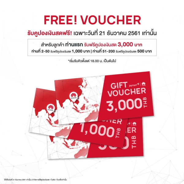 เพียงเข้าร่วมงานเปิดตัว Huawei Experience Store ใหญ่ที่สุดในเอเชียแปซิฟิก สาขาสยามพารากอน ในวันที่ 21 ธันวาคม วันเดียวเท่านั้น พิเศษ! ท่านแรกที่ลงทะเบียนเข้าร่วมงานจะได้รับบัตรกำนัลมูลค่า 3,000 บาท ท่านที่ 2 – 50 จะได้รับบัตรกำนัลมูลค่า 1,000 บาท และสำหรับท่านที่ 51 – 200 จะได้รับบัตรกำนัลมูลค่า 500 บาท*(หมายเหตุ* โดยบัตรกำนัลสามารถใช้แทนเงินสดได้เมื่อซื้อผลิตภัณฑ์ของหัวเว่ย ราคาตั้งแต่ 9,000 บาทขึ้นไป ต่อ 1 ใบเสร็จภายในงาน ณ วันที่ 21 ธันวาคมเท่านั้น)