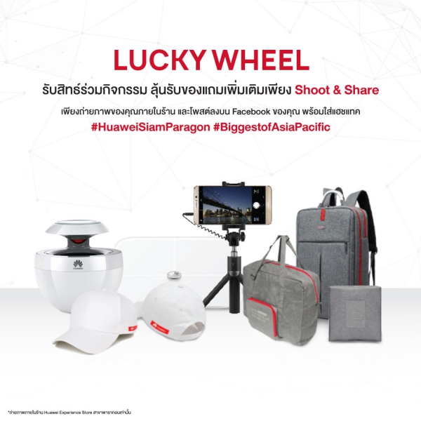 นอกจากนี้ สำหรับผู้ที่ถ่ายภาพ ณ Huawei Experience Store สาขา สยามพารากอน และโพสต์ลงบนเฟสบุ๊ก พร้อมติดแฮชแท็ก#HuaweiSiamParagon และ #BiggestofAsiaPacific รับสิทธิ์หมุนวงล้อนำโชคเพื่อลุ้นรับของรางวัลที่หัวเว่ยขนทัพมาแบบจัดเต็ม อาทิ Bluetooth Speaker รุ่น AM08, HUAWEI Body fat Scale, Travel Bag, Business Casual Backpack, Tripod Af14 และ Baseball Cap เฉพาะวันที่ 21ธันวาคมเท่านั้น