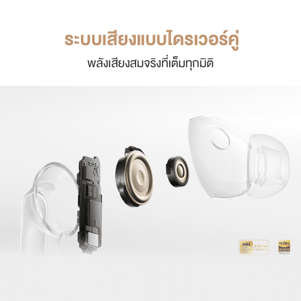 HUAWEI FreeBuds Pro 5 มอบประสบการณ์เสียงที่ทรงพลังแบบ Over-ear ด้วยระบบลำโพงแบบระบบไดรเวอร์คู่ แยกการทำงานของเสียงความถี่สูงและต่ำอย่างอิสระ ถ่ายทอดเสียงได้อย่างสมจริงในทุกมิติ ทั้งเสียงแหลมที่คมชัด เบสที่ลึกทรงพลัง และรายละเอียดเสียงที่ครบถ้วน รองรับเทคโนโลยี L2HC 4.0 audio codec ที่สามารถส่งสัญญาณเสียงคุณภาพระดับ Lossless สูงสุด 2.3 Mbps เพื่อให้ได้คุณภาพเสียงที่ใกล้เคียงต้นฉบับมากยิ่งขึ้น พร้อม 4 โปรไฟล์เสียง HUAWEI SOUND ได้แก่ เน้นสมดุลที่ฟังสบายได้ทุกแนว ชูเสียงร้องให้โดดเด่นชัดเจน ให้มิติและรายละเอียดเครื่องดนตรี เพิ่มพลังเสียงต่ำให้หนักแน่นดั่งใจ ให้ผู้ใช้งานสามารถปรับแต่งประสบการณ์การฟังได้ตามความต้องการ