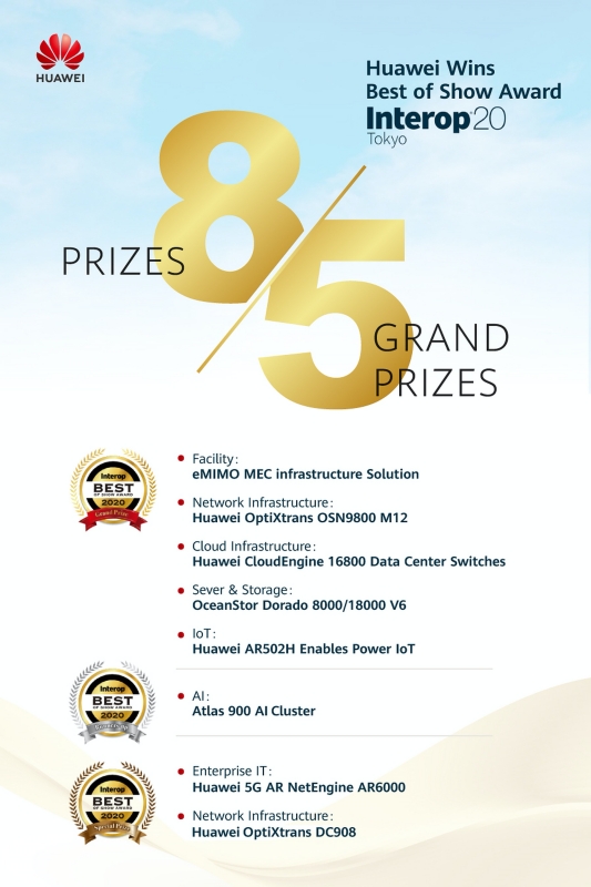 การระบาดของโควิด-19 ส่งผลให้เกิดการเปลี่ยนแปลงที่ไม่เคยปรากฏมาก่อนต่อหลายภาคอุตสาหกรรม ทว่าวิกฤตการณ์ดังกล่าวไม่อาจหยุดยั้งการพัฒนาอย่างรวดเร็วของอุตสาหกรรมไอซีทีได้ ดังจะเห็นได้จากการที่คณะกรรมการจัดงาน Interop Tokyo 2020 งานมหกรรมด้านไอซีทีที่ใหญ่ที่สุดในประเทศญี่ปุ่น ประกาศรายชื่อผู้ชนะรางวัล Best of Show Awards โดยผลิตภัณฑ์และโซลูชันของหัวเว่ยคว้าชัยชนะมาทั้งสิ้น 8 รางวัล และในจำนวนนี้ยังเป็นรางวัลใหญ่ถึง 5 รางวัลด้วยกัน โดยมีรายละเอียดดังนี้