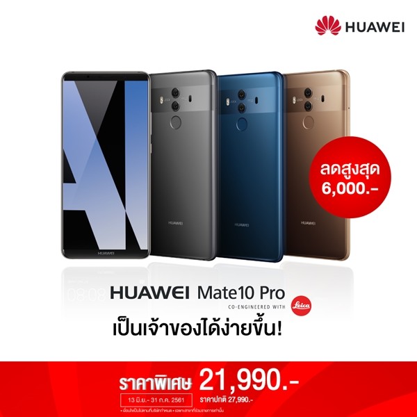 หัวเว่ยให้คุณเป็นเจ้าของ HUAWEI Mate 10 Pro สมาร์ทโฟนอัจฉริยะที่ประมวลผลด้วยเทคโนโลยี AI รุ่นแรกของโลกซึ่งมาพร้อมกล้องคู่เทคโนโลยีจาก Leica ในราคาพิเศษเพียง 21,990 บาท ตั้งแต่วันนี้ – 31 กรกฎาคม 2561 ณ หัวเว่ยแบรนด์ช้อป และร้านตัวแทนจำหน่ายที่ร่วมรายการทั่วประเทศ แถมท้ายสำหรับลูกค้าAIS, DTAC และ TrueMove H รับส่วนลดสูงสุด 50% เมื่อสมัครแพ็กเกจการใช้งานตามเงื่อนไขที่กำหนด