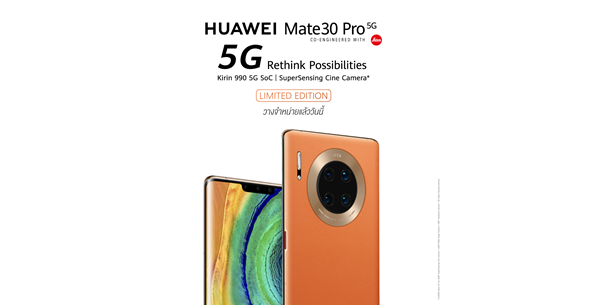 หัวเว่ยพร้อมวางจำหน่าย HUAWEI Mate 30 Pro 5G สมาร์ทโฟนรองรับเครือข่าย 5G ที่พร้อมใช้งานแล้วในประเทศไทยครบทั้ง 3 ผู้ให้บริการเครือข่าย AIS, dtac และ TrueMove H โดย HUAWEI Mate 30 Pro 5G มาในดีไซน์ Orange สีสุดพรีเมียม ราคาเพียง 31,990 บาท โดยจะเริ่มวางจำหน่ายผ่านผู้ให้บริการเครือข่ายและร้านค้าที่ร่วมรายการ ตั้งแต่วันที่ 5 มีนาคมนี้เป็นต้นไป