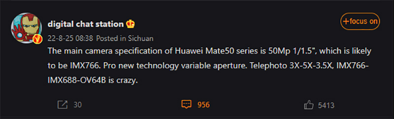 Digital Chat Station ที่เป็นจอมแม่นของฝั่งจีนได้เปิดเผยสเปคกล้อง Mate 50 Series ว่าจะมีกล้องหลังความละเอียดสูงสุด 50 ล้านพิกเซล พร้อมใช้เซ็นเซอร์ขนาด 1/1.5 นิ้ว ซึ่งน่าจะเป็น Sony IMX766 ทั้งนี้ ใน Mate 50 Pro จะรองรับเทคโนโลยีการปรับค่ารูรับแสงได้ด้วย