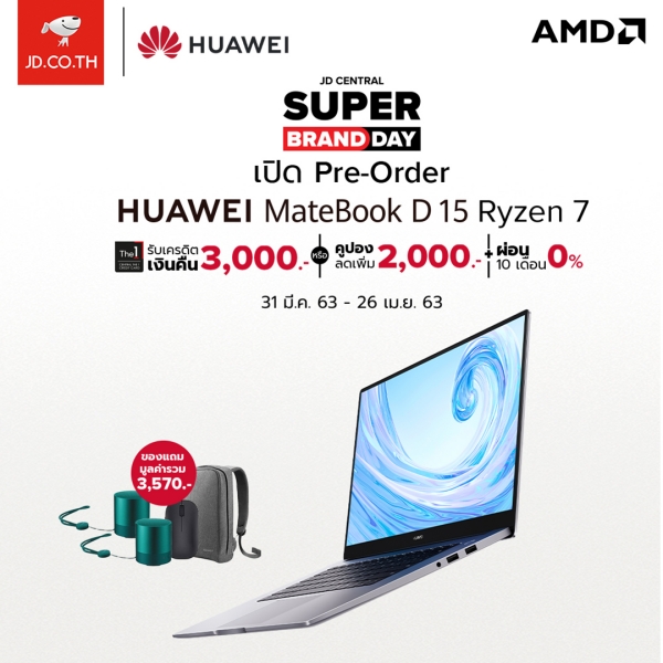 HUAWEI MateBook D 15 Ryzen 7 สี Space Grey เปิดให้พรีออเดอร์แล้วที่ราคา 19,990 บาท โดยสามารถสั่งจองได้ผ่านเว็บไซต์เจดี เซ็นทรัล (JD Central) ที่ www.jd.co.th ภายในวันที่ 31 มีนาคม 2563 ถึง 26 เมษายน 2563 พร้อมรับของแถมมูลค่ารวม 3,570 บาท และยังได้รับเครดิตเงินคืน 3,000 บาทเมื่อจ่ายครบด้วยบัตร Central The 1 Credit Card หรือรับคูปองส่วนลด 2,000 บาท พร้อมผ่อน 0% นาน 10 เดือน และจะเริ่มจัดส่งสินค้า 31 เมษายน เป็นต้นไป