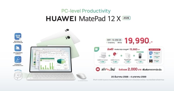 HUAWEI MatePad 12 X (2026) สั่งซื้อได้แล้ววันนี้ในราคาเพียง 19,990 บาท พร้อมรับฟรีของสมนาคุณ มูลค่ารวมถึง 15,660 บาท เมื่อสั่งซื้อระหว่างวันที่ 25 ธันวาคม 2568 ถึง 4 มกราคม 2569 ทั้ง HUAWEI Smart Magnetic Keyboard มูลค่า 6,990 บาท HUAWEI M-Pencil Pro มูลค่า 5,490 บาท 66W SuperCharge Power Adapter มูลค่า 1,690 บาท HUAWEI Bluetooth Mouse มูลค่า 1,490 บาทเฉพาะช่วงพรีออเดอร์เท่านั้น พร้อมติดตั้งแอปพลิเคชันฟรีได้แก่ PC-level WPS Office 3.0 มูลค่า 3,990 บาท HUAWEI Notes มูลค่า 1,990 และ GoPaint มูลค่า 1,990 บาท รวมไปถึงส่วนลดเก่าแลกใหม่ 2,000 บาท เมื่อสั่งซื้อที่หน้าร้าน HUAWEI Experience Store และร้านค้าตัวแทนจำหน่ายที่ร่วมรายการ รวมถึงช่องทางออนไลน์ผ่านร้านค้าอย่างเป็นทางการบน HUAWEI StoreLazadaShopee และ TikTok Shop