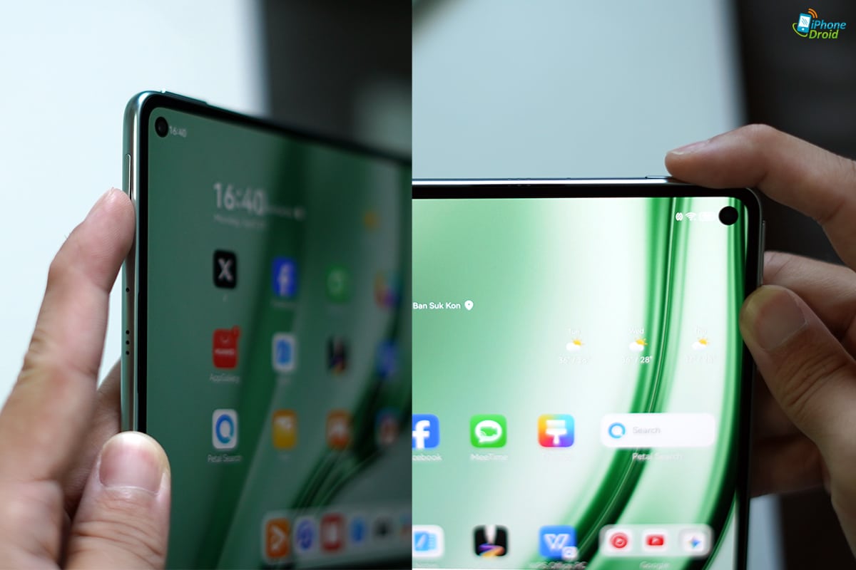 ส่วนการตอบสนอง พอเป็นจอแบบนี้ ก็ช่วยให้สัมผัสนั้นลื่นไหล บวกเข้ากับ Refresh rate สูง 120Hz และซอฟต์แวร์ HarmonyOS ภายใน ก็ทำให้การทำงานดูลื่นไหล ติดนิ้วขั้นสุด