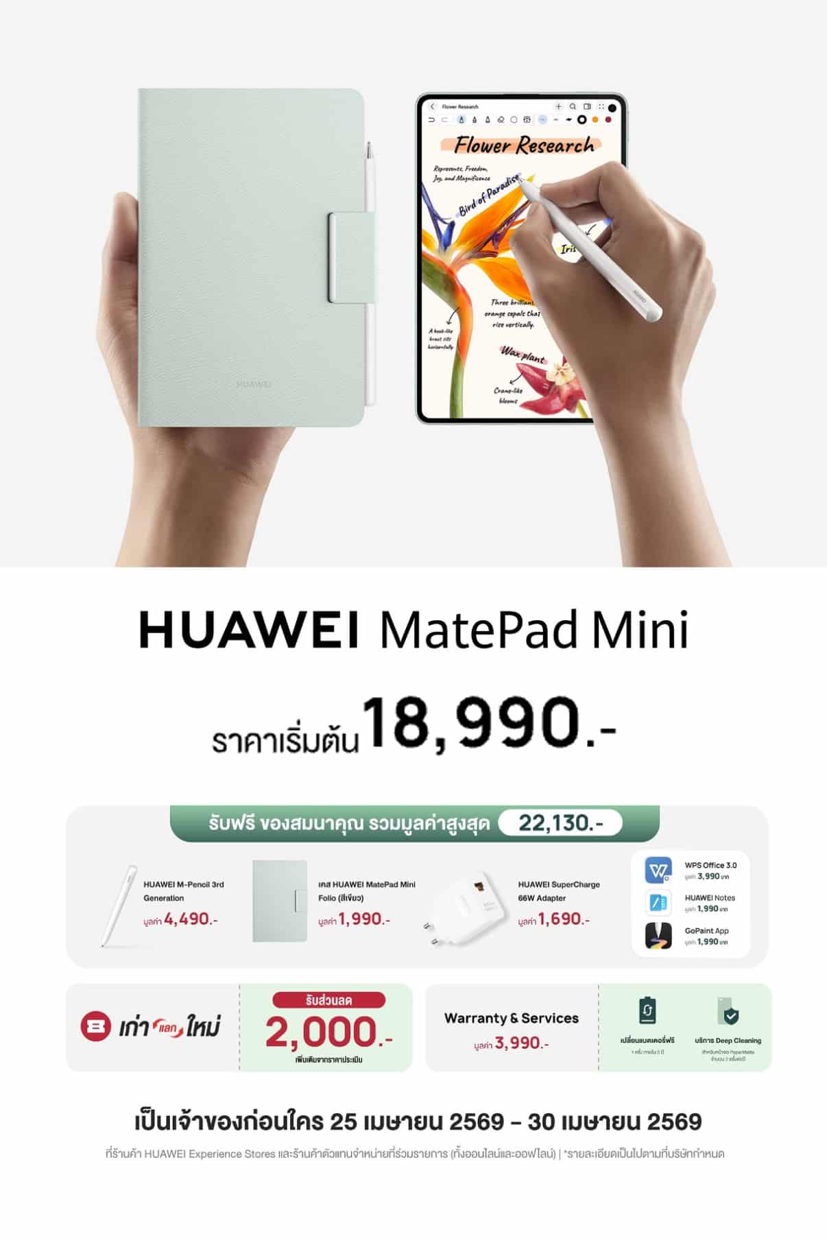 HUAWEI MatePad Mini เปิดตัวในไทยมาที่ 18,990 บาท สำหรับรุ่นที่แถม M-Pencil รุ่นที่ 3 และสามารถอัปเกรดเป็น M-Pencil Pro ได้ในราคา 20,990 บาทครับ