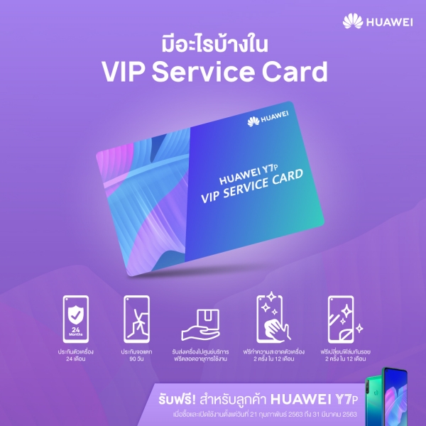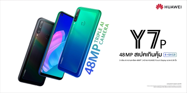 HUAWEI Y7p ที่มาพร้อม RAM 4GB ROM 64GB เรียกได้ว่าเป็นผู้นำในด้านกล้อง และเทคโนโลยีการถ่ายภาพ ประกอบไปด้วย กล้องหลัง 3 กล้อง ได้แก่ กล้องหลัก 48MP ที่สามารถถ่ายภาพนิ่งความละเอียดสูงสุดมากกว่า 8K กล้องมุมกว้าง 8MP ครอบคลุมถึง 120 องศา และกล้อง 2MP ช่วยสร้างความลึกเสมือนจริง ยกระดับประสบการณ์การถ่ายภาพอย่างเป็นมืออาชีพ อีกทั้งยังมีกล้องหน้าแบบ Punch FullView Display ความคมชัด 8MP ที่ทำงานด้วยระบบ AI ของหัวเว่ย สามารถถ่ายเซลฟี่ได้สวยอย่างเป็นธรรมชาติ รองรับการถ่ายภาพนิ่งความละเอียดสูงสุดมากกว่า 4K ทั้งยังตอบโจทย์ไลฟ์สไตล์ความบันเทิง สำหรับคอหนังและซีรี่ส์ ด้วยหน้าจอขนาด 6.39 นิ้ว ความคมชัด ระดับ HD+ 1560 x 720 พิกเซล ขุมพลังชิพเซ็ต Kirin 710F GPU Turbo และช่วยยกระดับประสบการณ์ให้สายอีสปอร์ตทุกคนเล่นเกมสุดมันส์ได้ทุกที่ทุกเวลา มาพร้อม HUAWEI AppGallery ที่มีแอปพลิเคชันสุดฮิตต่างๆ มากมาย บนระบบ HUAWEI Mobile Services (HMS) นอกจากนี้ลูกค้าที่ซื้อและเปิดใช้งาน HUAWEI Y7p ตั้งแต่ 21 กุมภาพันธ์ 2563 จนถึง 31 มีนาคม 2563 รับฟรี! สิทธิพิเศษสำหรับบริการ HUAWEI Y7p VIP Service มูลค่า 2,239 บาท ประกอบด้วย