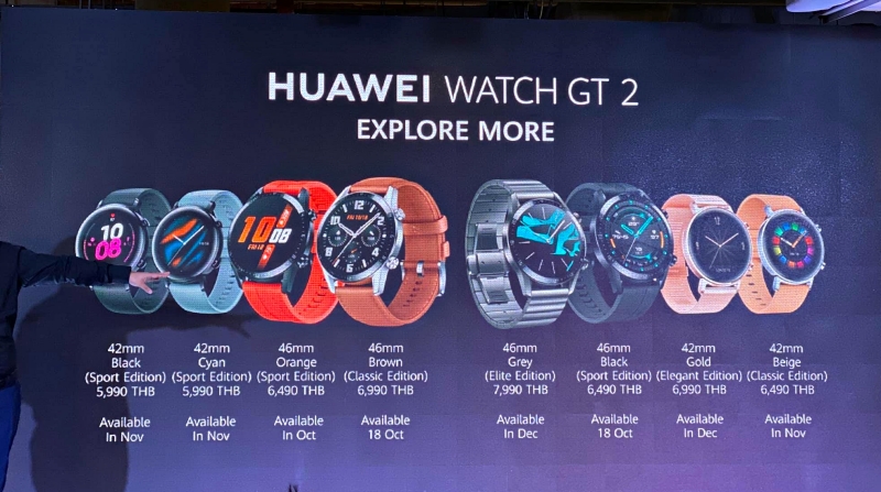 HUAWEI จะวางจำหน่าย HUAWEI Watch GT 2 ขนาดหน้าจอ 46 มิลลิเมตร จำนวน 2 รุ่น คือ รุ่น Classic ราคา 6,990 บาท และ รุ่น Sport ราคา 6,490 บาท พร้อม HUAWEI Band 4 ราคา 999 บาท ในวันที่ 18 ตุลาคมเป็นต้นไป ณ HUAWEI แบรนด์ ช้อป และร้านตัวแทนจำหน่ายที่ร่วมรายการทั่วประเทศ สำหรับรุ่นอื่นๆ จะทยอยวางจำหน่ายเร็วๆ นี้