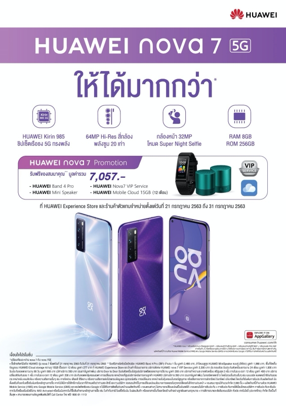 พิเศษสุด! กับโปรโมชั่นเอาใจหัวเว่ยแฟนเมื่อซื้อ HUAWEI nova 7 รับทันทีสิทธิพิเศษสำหรับบริการ HUAWEI nova 7 VIP Service มูลค่า 2,300 บาท ประกอบด้วย: