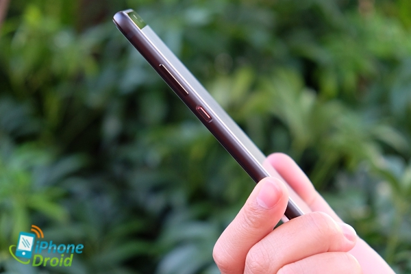 ขอบด้านซ้ายมีช่องถาดใส่ซิม รองรับซิมการ์ดขนาด Nano SIM ทั้ง 2 ช่อง หรือจะเลือกใส่ microSD card แทนซิม 2 ก็ได้
