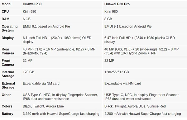 ในเรื่องของสีสันนั้นสมาร์ทโฟน Huawei P30 และ Huawei P30 Pro จะมีสีเหมือนกันคือ Black, Twilight และ Aurora Blue แต่เราอาจได้เห็นสี Sunrise Red ออกมาเหมือนกัน แต่สิ่งที่แตกต่างอย่างเห็นได้ชัดระหว่างสมาร์ทโฟน 2 รุ่นนี้ก็คือรุ่น P30 จะยังคงมีแจ็คหูฟัง 3.5 มม. อยู่แต่ในรุ่น P30 Pro จะไม่มีการติดตั้งแจ็คหูฟังมาด้วย