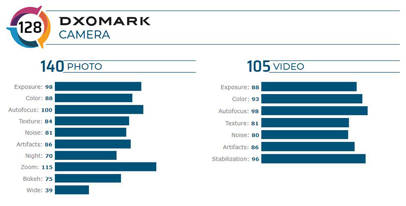 คะแนนเฉลี่ยกล้องหลังของ Huawei P40 Pro อยู่ที่ 128 แต้ม (140 คะแนนเฉพาะภาพนิ่ง) นำห่าง OPPO Find X2 Pro และ Xiaomi Mi 10 Pro ที่มี 124 คะแนนเท่ากัน ขณะที่กล้องหน้าทำคะแนนไป 103 ซึ่งนำคู่แข่งในแบรนด์เดียวกันอย่าง Nova 6 5G ที่มี 100 คะแนนพอดี