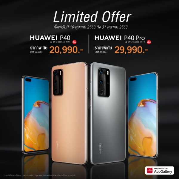 สมาร์ทโฟน 2 รุ่น ยอดนิยมจาก HUAWEI P40 Series ลดราคาพิเศษเพื่อเฉลิมฉลองการได้รับรางวัล Good Design Award เปิดโอกาสให้ทุกคนได้จับจองเป็นเจ้าของสมาร์ทโฟนเรือธงที่มาพร้อมนวัตกรรมการดีไซน์สุดล้ำ โดย HUAWEI P40 ลดราคาจาก 22,990 บาท เหลือ 20,990 บาท และ HUAWEI P40 Pro จาก 31,990 บาท เหลือ 29,990 บาท ตั้งแต่วันที่ 16 ตุลาคม – 31 ตุลาคม 2563 ณ HUAWEI Experience Store และร้านค้าที่ร่วมรายการเท่านั้น* รายละเอียดเงื่อนไขและสาขาที่ร่วมรายการ สามารถคลิกอ่านเพิ่มเติมได้ที่นี่ และสำหรับผู้ใช้สมาร์ทโฟนหัวเว่ยสามารถดาวน์โหลดแอปพลิเคชันโปรดผ่านทาง #AppGallery และ #PetalSearch ช่องทางสู่แอปนับล้านได้แล้ววันนี้