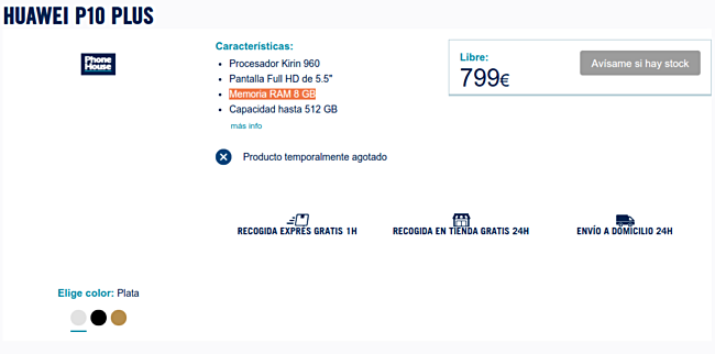 นอกจากนี้แล้ว ยังมีข้อมูลบนเว็บไซต์ค้าปลีกออนไลน์ PhoneHouse ประเทศสเปน ได้นำข้อมูลรุ่น Huawei P10 Plus ขึ้นไปแสดงบนเว็บไซต์ ซึ่งเผยสเปคว่ารุ่นดังกล่าวมีแรมมากถึง 8GB และรองรับความจำได้สูงสุด 512GB