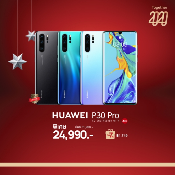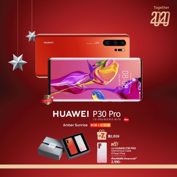 HUAWEI P30 Pro และ HUAWEI P30 สมาร์ทโฟนรุ่นเรือธงกระแสดีไม่มีตก ด้วยฟีเจอร์กล้องชั้นเลิศที่ฉีกทุกกฏเกณฑ์ของการถ่ายภาพ สามารถเติมเต็มทุกจินตนาการ และบันทึกทุกโมเม้นต์ความทรงจำ พบกับราคาพิเศษ สำหรับลิมิเต็ดเอดิชั่นเซ็ต สี Amber Sunrise ในราคา 37,990 บาท (ลดเพิ่มทันทีอีก 2,659 บาท) มาพร้อมเคสประดับคริสตัลจาก Swarovski® มูลค่า 2,990 บาท, HUAWEI P30 Pro ราคา 24,990 บาท (ลดเพิ่มทันทีอีก 1,749 บาท) และ HUAWEI P30 ในราคา 15,990 บาท (ลดเพิ่มทันทีอีก 1,119 บาท)