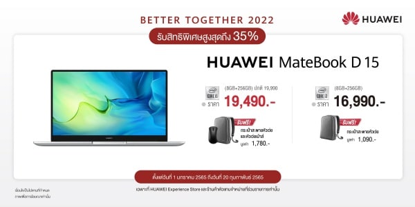 - HUAWEI MateBook D 15 (i5) 8GB+256GB แล็ปท็อปดีไซน์คลาสสิกสเปกโดนใจ มาในราคาพิเศษ 19,490 บาท จากราคาปกติ 19,990 บาท พร้อมรับฟรี กระเป๋าสะพายหัวเว่ยและหัวเว่ยเม้าส์ รวมมูลค่า 1,780 บาท และ HUAWEI MateBook D 15 (i3) 8GB+256GB ราคา 16,990 บาท พร้อมรับฟรีกระเป๋าสะพายหัวเว่ยมูลค่า 1,090 บาท