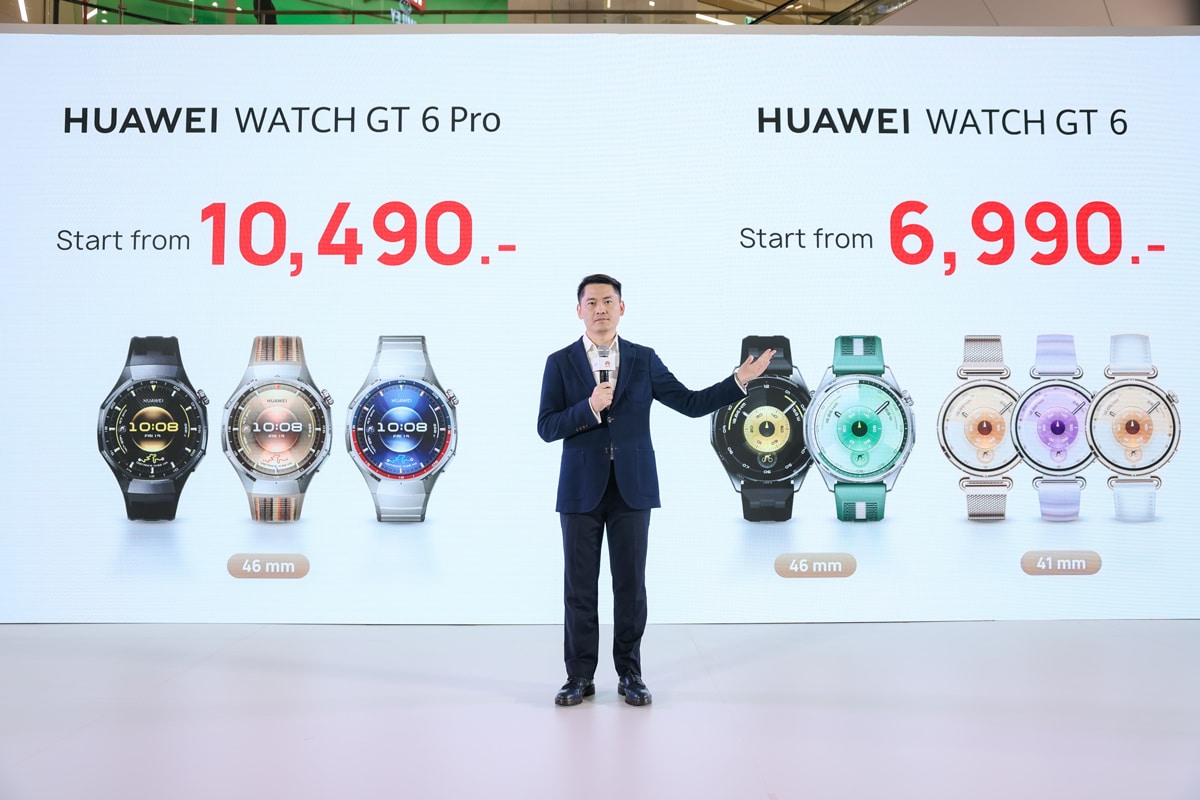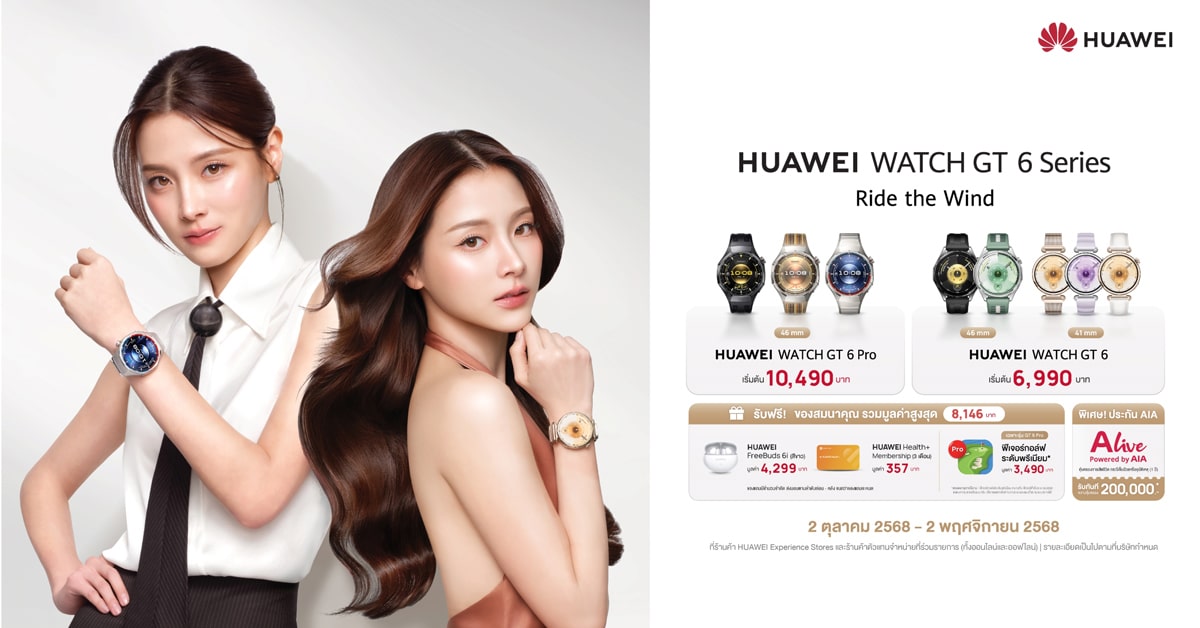 HUAWEI WATCH GT 6 Series วางจำหน่ายอย่างเป็นทางการแล้วในประเทศไทย โดย HUAWEI WATCH GT 6 Pro (46 มม.) ราคาเริ่มต้น 10,490 บาท มีให้เลือกทั้งสีดำ สีน้ำตาล และสีไทเทเนียม ส่วน HUAWEI WATCH GT 6 (46 มม.) ราคาเริ่มต้น 6,990 บาท มาพร้อมสีเขียว และสีดำ และ HUAWEI WATCH GT 6 (41 มม.) ราคาเริ่มต้น 6,990 บาท มีให้เลือกในสีม่วง สีขาวสายหนัง และสีทอง Milanese Gold พิเศษ! เมื่อซื้อระหว่าง 2 ตุลาคม 2568 – 2 พฤศจิกายน 2568 รับของสมนาคุณมูลค่ารวมสูงสุด 8,146 บาท อาทิ HUAWEI FreeBuds 6i (สีขาว) มูลค่า 4,299 บาท, HUAWEI Health+ Membership 3 เดือน มูลค่า 357 บาท และฟีเจอร์กอล์ฟระดับพรีเมียม มูลค่า 3,490 บาท พร้อมประกันภัย ALive Powered by AIA คุ้มครองชีวิตจากการเจ็บป่วยและอุบัติเหตุ 1 ปี สูงสุด 200,000 บาท
