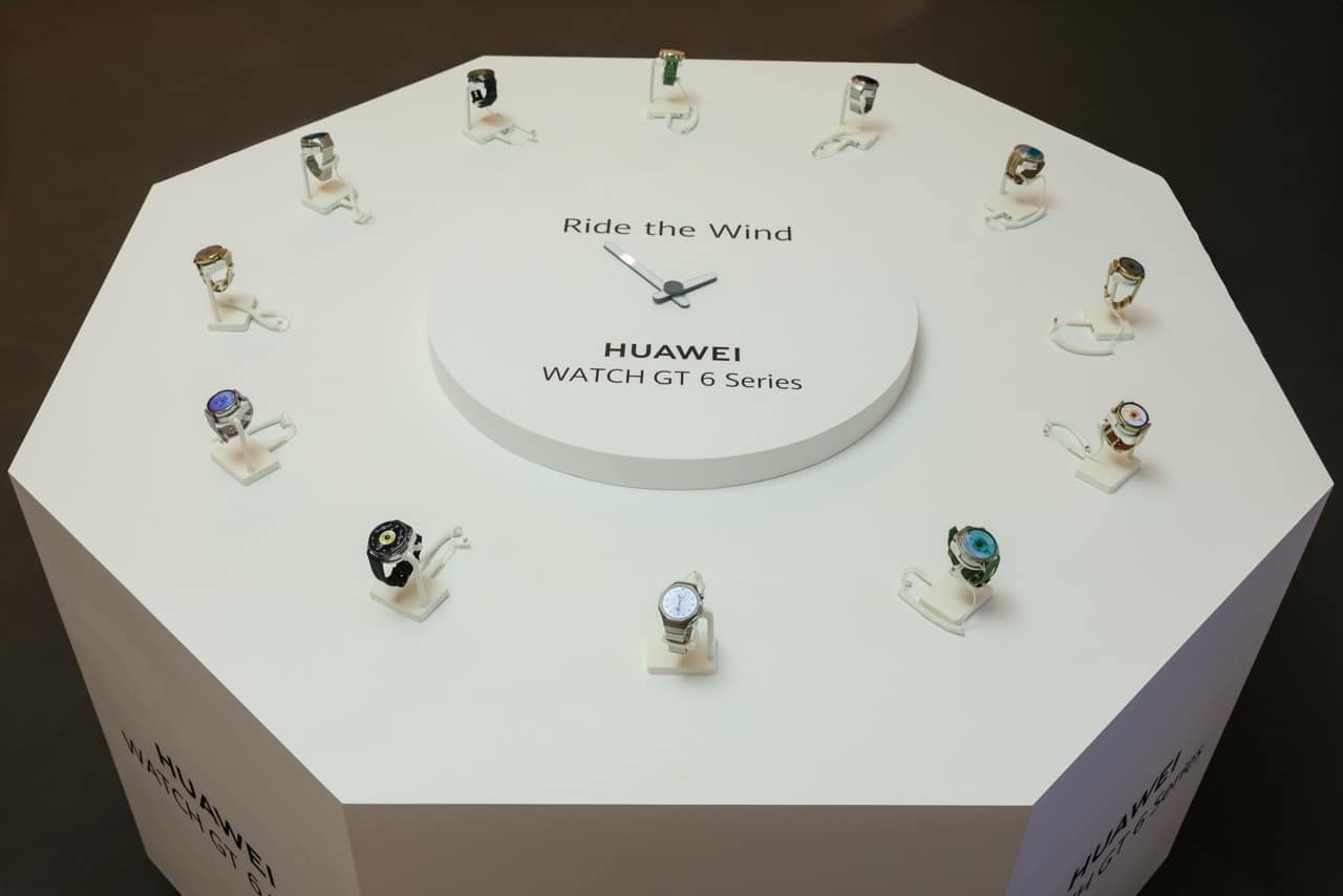 - HUAWEI WATCH GT 6 (41 มม.) นำเสนอความสง่างามที่คล่องตัวและกะทัดรัด หน้าจอ AMOLED ขนาด 1.32 นิ้ว พร้อมขอบหน้าปัดตัวเลขโรมันสุดหรู และเป็นรุ่นแรกที่มาพร้อมสลักยึดสายแบบหมุนได้ ที่โค้งรับกับข้อมือเล็กได้อย่างพอดี มีให้เลือกทั้งสายหนังวีแกนคอมโพสิตสีขาว, สายฟลูออโรอีลาสโตเมอร์สีม่วง และสายโลหะ Milanese Gold