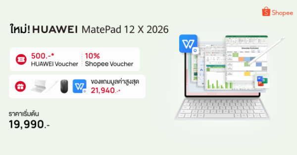 หัวเว่ย คอนซูมแมอร์ บิสสิเนส กรุ๊ป จับมือกับ Shopee ผู้นำแพลตฟอร์มอีคอมเมิร์ซในเอเชียตะวันออกเฉียงใต้  พานักช้อปสัมผัส “ขั้นกว่า” ของประสบการณ์การใช้งานแท็บเล็ตด้วย HUAWEI MatePad 12 X (2026) ที่ยกสมรรถนะจัดเต็มในระดับเดียวกับเครื่องพีซี ซึ่งเหนือชั้นไปอีกขั้นด้วยการใช้งานที่ลื่นไหลยิ่งกว่า ฟีเจอร์ที่ชาญฉลาดกว่า และดีไซน์ที่บางเบากว่าใคร พร้อมตอบโจทย์ทั้งการทำงานระดับโปรและความบันเทิงเต็มรูปแบบ ในราคาเริ่มต้นที่ 19,990 บาท ที่ร้านค้าหัวเว่ยอย่างเป็นทางการบน Shopee เท่านั้น พร้อมยกทัพข้อเสนอและของสมนาคุณสิทธิพิเศษรวมถึง 21,940 บาท