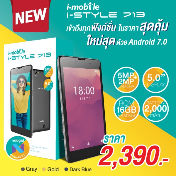 i-mobile i-Style 713 เข้าถึงทุกฟังก์ชั่นสะดวกด้วยหน้าจอ 5 นิ้ว จับกระชับมือ พร้อมระบบปฏิบัติการเวอร์ชั่น Android 7.0 Nougat เร็วแรงทุกการสัมผัส ไม่ว่าจะเล่น Facebook , Line หรือ Application อื่นๆ ก็สามารถใช้งานได้อย่างง่ายดาย เซลฟี่สวยๆด้วยกล้องหน้า 2 ล้านพิกเซล และกล้องหลัง 5 ล้านพิเซล พร้อมแฟลช ในราคาสุดคุ้มสบายกระเป๋า เพียง 2,390 บาท