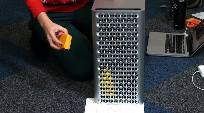 สำหรับ Mac Pro นั้นมาพร้อมกับเคสแบบโลหะด้านนอกที่เคยถูกเอาล้อเลียนกับที่ขูดชีสของจริง ซึ่ง iFixit ก็ไม่รอช้าที่จะมาลองขูดโชว์กันสักตั้ง และมีการบอกด้วยมันขูดไม่ค่อยดีเท่าไหร่ แต่ก็สามารถทำความสะอาดได้อยู่ดีนั่นแหละ