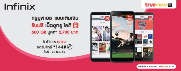 ตอกย้ำความแรงของแบรนด์อินฟินิกซ์  กับการร่วมมือมือกับพันธมิตร ทรูมูฟ เอช มอบโปรโมชั่นพิเศษ ต้อนรับปีหมูทอง สำหรับลูกค้าทรูมูฟ เอช แบบเติมเงิน และซื้ออินฟินิกซ์สมาร์ทโฟน ทุกรุ่น ทั้งจากร้านค้าตัวแทนจำหน่ายทั่วประเทศ และร้านค้าออนไลน์  “รับฟรี เน็ตดูทรูไอที จำนวน 600 กิกะไบท์ มูลค่าถึง 2,700 บาท” เพื่อรับชมความบันเทิงทั้ง ลีกฟุตบอลไทยและลีกดังระดับโลกทั้งแบบสดและแบบรีรัน  โปรแกรมหนังฮิต และซี่รี่ส์ดัง  อัปเดทเพลงอิทติดชาร์ท หรือดูทีวีออนไลน์ได้ทุกที่ สนุกทุกเวลา  เพียงลูกค้าทำการกดรับสิทธิ์จากตัวเครื่อง *144#โทรออก