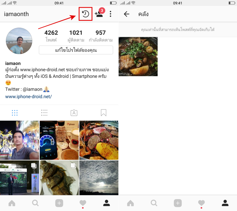 รูปภาพที่ถูกเลือก จัดเก็บ (Archive) ไปแล้ว จะไปอยู่ในโฟเดอร์คลังรูปภาพส่วนตัว สามารถเข้าไปดูได้ที่หน้าโปรไฟล์ส่วนตัวของเรา โดยแตะไปที่ไอคอน ลูกศรย้อนกลับ ที่อยู่บริเวณแถบบนของหน้าจอ
