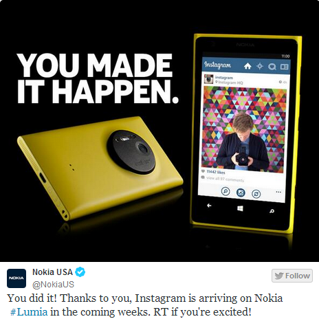 Nokia สหรัฐอเมริกาได้ทวีตข้อความพร้อมภาพ Instagram เวอร์ชั่นสำหรับ Nokia Lumia และระบบปฎิบัติการ Windows Phone ทุกรุ่นกำลังจะมาแล้ว