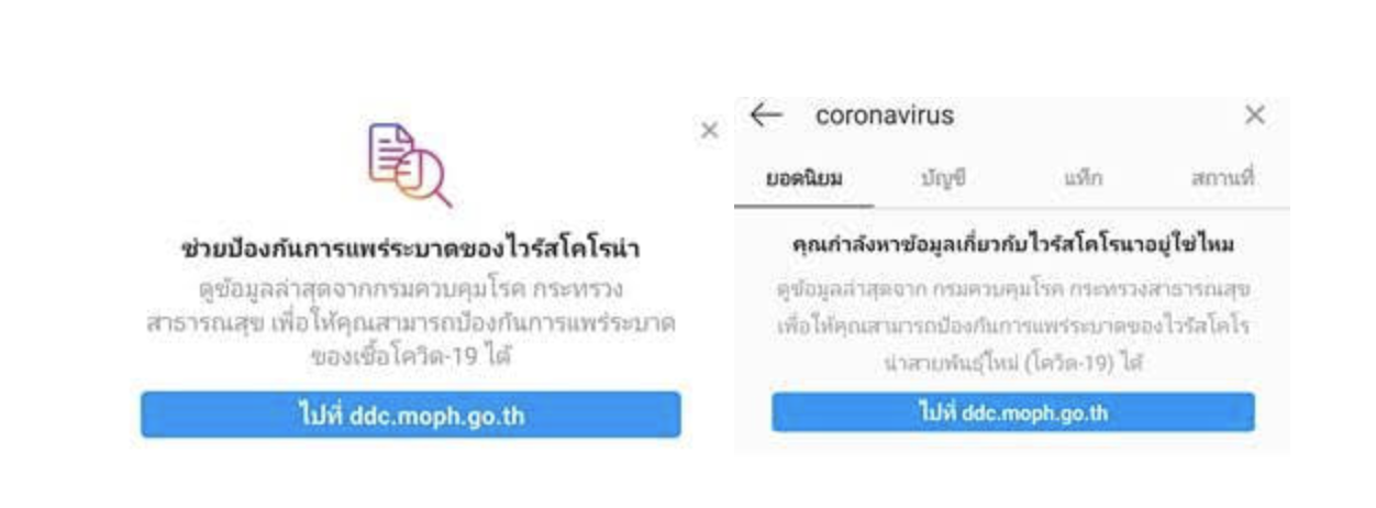 ผู้ใช้งานที่ค้นหาข้อมูลเกี่ยวกับโควิด-19 บน Instagram จะได้รับข้อความที่เชื่อมสู่แหล่งข้อมูลที่น่าเชื่อถือต่างๆ จากองค์การอนามัยโลก (WHO) และหน่วยงานด้านสาธารณสุขท้องถิ่น นอกจากนี้ Instagram ยังได้เพิ่มการแจ้งเตือนทางด้านบนสุดของหน้าข่าวที่รวบรวมแหล่งข้อมูลและอัปเดตจากองค์กรด้านสุขภาพ สำหรับในประเทศไทย จะปรากฏ ลิ้งก์ที่จะนำไปยังข้อมูลล่าสุดจากกรมควบคุมโรค กระทรวงสาธารณสุข