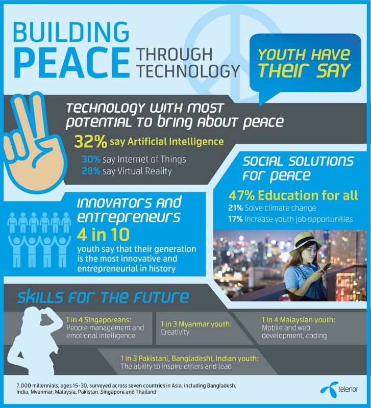จากผลการสำรวจ จากผู้ตอบแบบสอบถามจำนวน 7,000 คน อายุระหว่าง 15-30 ปี ใน 7 ประเทศของภูมิภาคเอเชียที่เทเลนอร์ดำเนินธุรกิจอยู่ ได้แก่ พม่า มาเลเซีย สิงคโปร์ อินเดีย ปากีสถาน บังคลาเทศ และไทย โดย 37% ของผู้ตอบแบบสอบถามระบุว่าปัญหาการเข้าถึงทางการศึกษายังคงเป็นอุปสรรคในการสร้างสันติภาพของโลก พร้อมทั้งเสนอว่าผู้นำประเทศและสังคมควรให้ความสำคัญและลงทุนเพิ่มมากขึ้นในการพัฒนาระบบการศึกษา เพื่อให้เข้าถึงและมีโอกาสอย่างเท่าเทียม ขณะที่ 21% มองว่าปัญหาโลกร้อนจะนำไปสู่ปัญหาความขัดแย้ง ตามด้วยปัญหาทางจิต (17%)ปัญหาการว่างงานในเยาวชน (17%) และ ความไม่เท่าเทียมทางเพศ (8%)